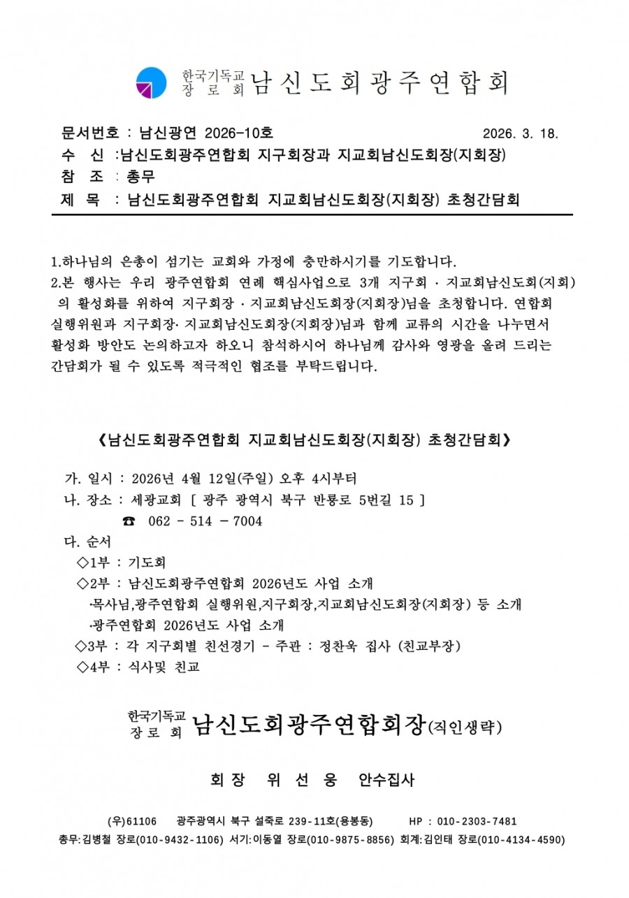 1. 본 행사는 광주연합회 연례 핵심사업으로 3개 지구회(동, 서, 북) 지교회남신도회의 활성화를 위하여 지회장님을 초청합니다.