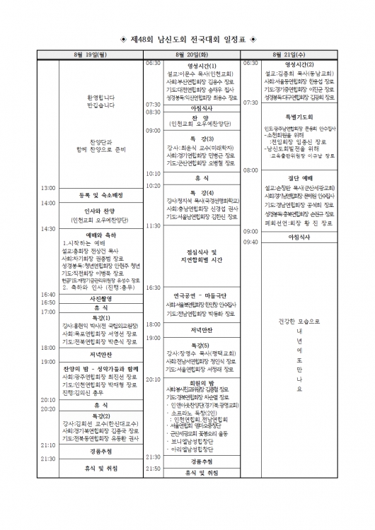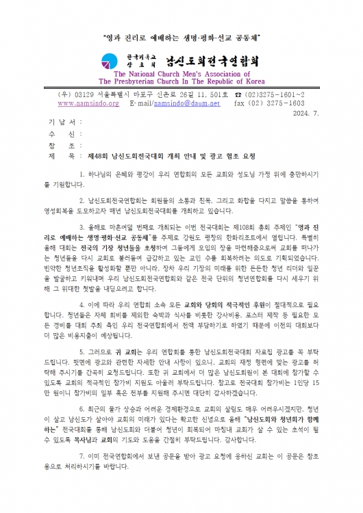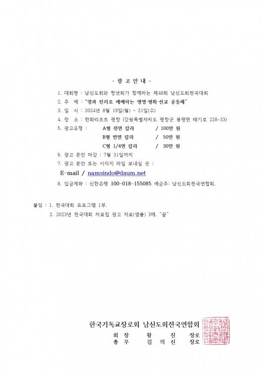제48회 남신도회전국연합회 전국대회 개최 공문(공통사용) 입니다. 각 지연합회장님께서는 올려드리는 공문 활용하여 많은 회원이 전국대회 참석 할 수 있도록 힘써 주시기 부탁드립니다. 아울러 공문에는 광고 사이즈별 금액과 예시도 있으니 풍성한 전국대회가 될 수 있도록 많은 협조 부탁드립니다.