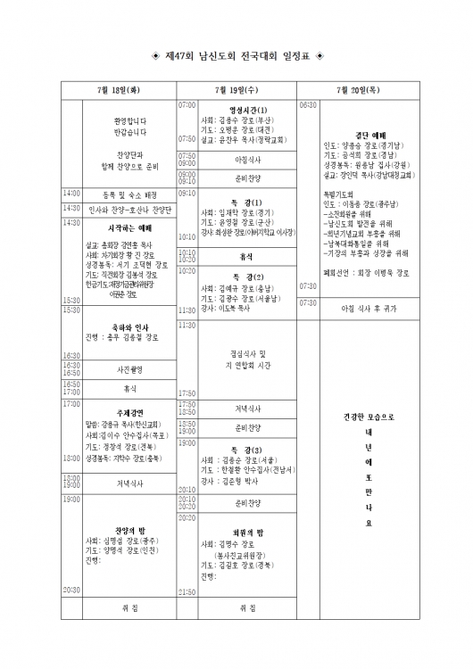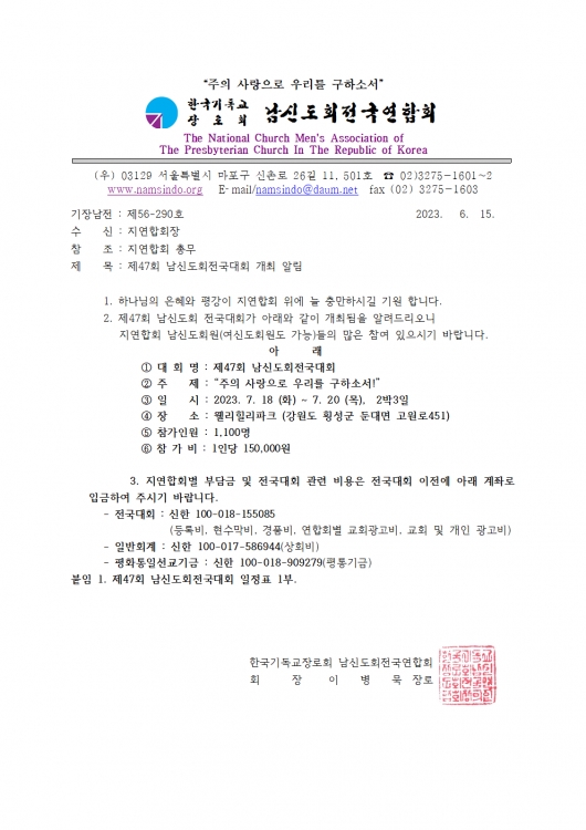 제47회 전국대회 개최 알림 페이지 정보 작성자 관리자 댓글 댓글 0건 조회Hit 4,512회 작성일Date 23-06-15 16:00 본문 제47최 전국대회 개최 알림 공문 입니다. 목록 이전글2023년 남신도회주일 지키기 협조 요청의 건 23.08.31 다음글제47회 남신도회전국대회 개최 안내 23.05.30 댓글 0 댓글목록 등록된 댓글이 없습니다.
