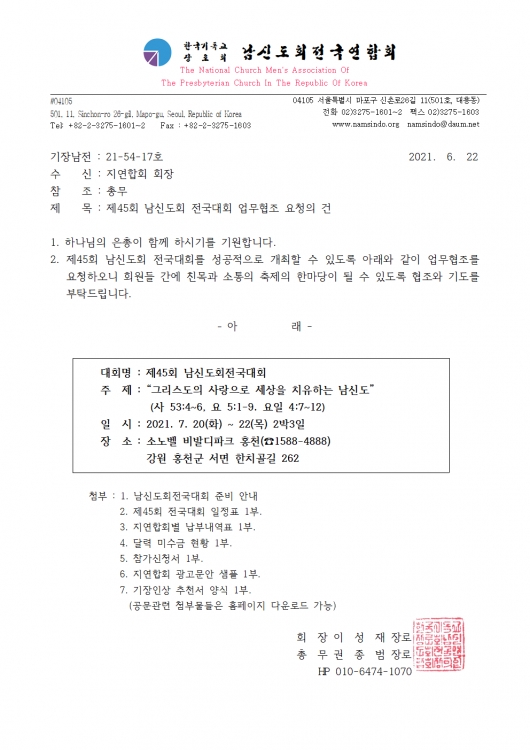 - 이전글제45회 남신도회전국대회 코로나19관련 업무협조안내 21.07.06