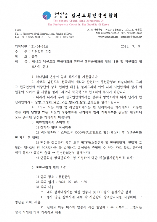 제45회 남신도회 전국대회와 관련한 홍천군청과의 협의 내용 및 지연합회 협조사항 안내