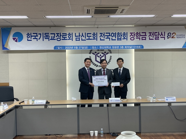 한국기독교장로회 남신도회전국연합회 회장 김봉석 장로와 교육출판위원회 위원장 황진 장로 한신대학교 강성영 총장에게 장학금을 전달하다